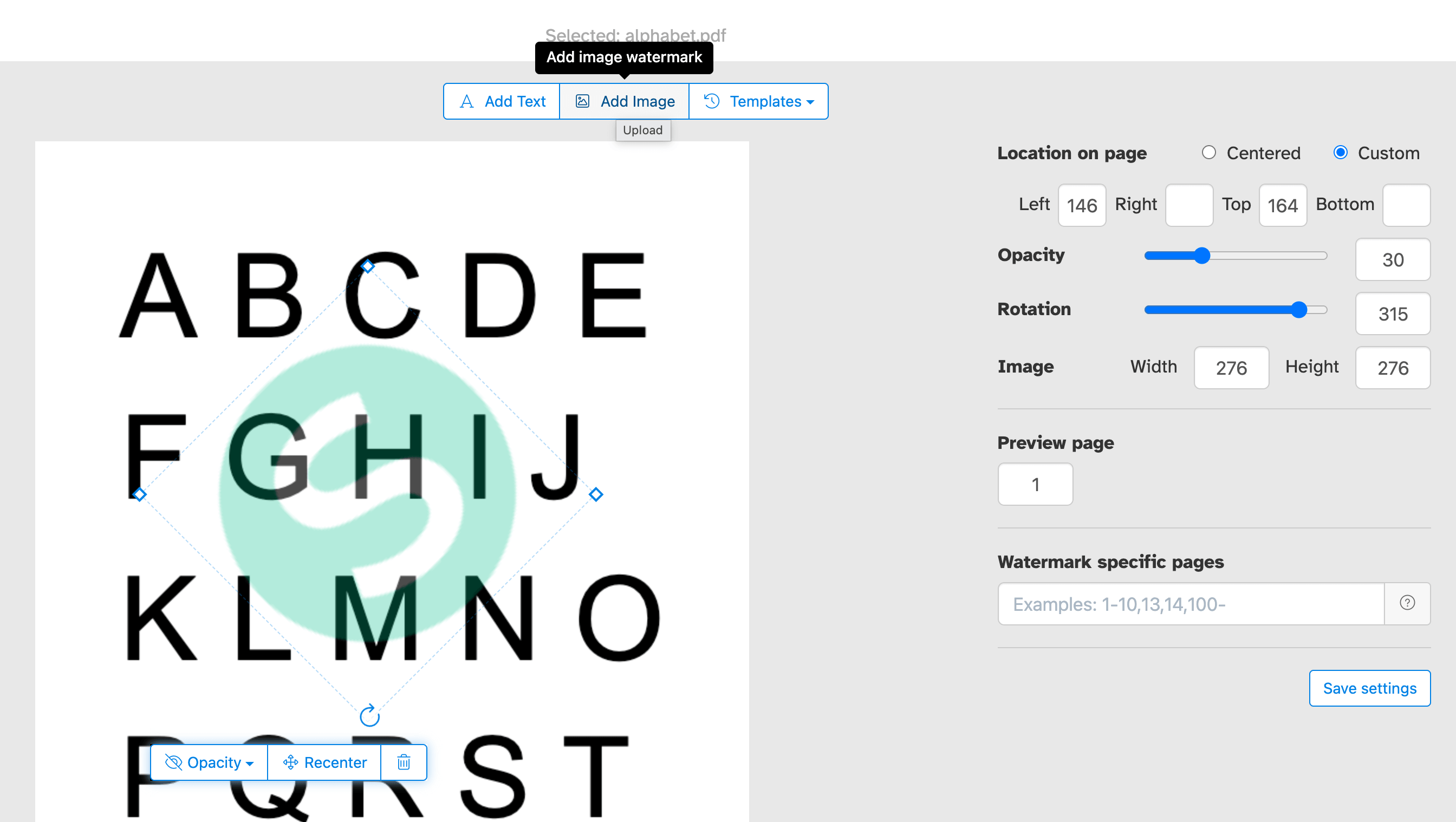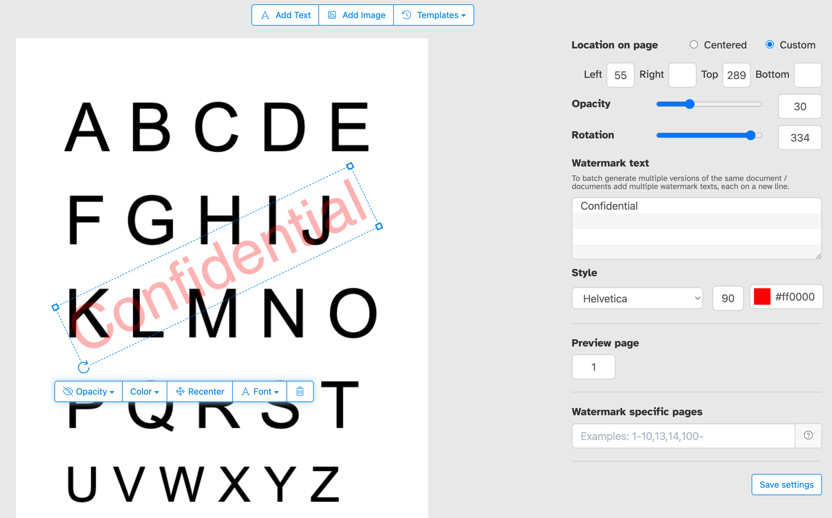 Sla je watermerkinstellingen op als template en hergebruik ze wanneer je maar wilt. Zodra je de tekst, het lettertype, de kleur, de grootte, de dekking en de positie hebt geconfigureerd, kun je die setup opslaan en met één klik op toekomstige documenten toepassen, zonder de instellingen telkens opnieuw aan te hoeven passen. Ideaal om regelmatig consistente watermerken toe te passen op meerdere documenten.