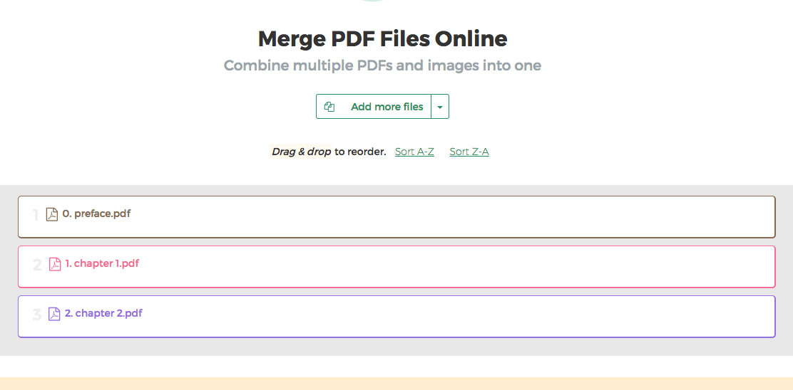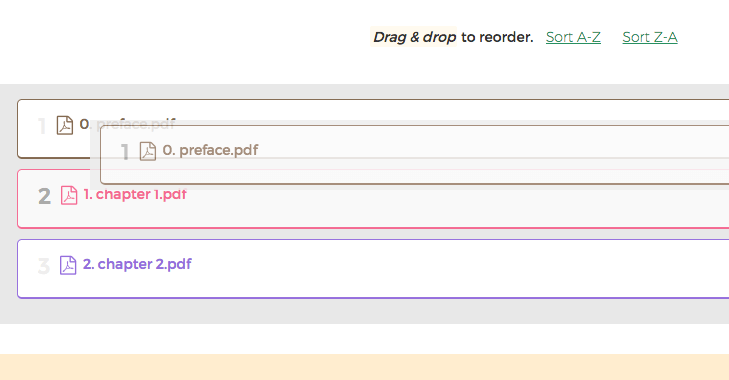 Dra och släpp filerna för att ändra ordningen. Använd sortera knappen för att sortera alfabetiskt efter filnamn 'A-Z' eller 'Z-A'